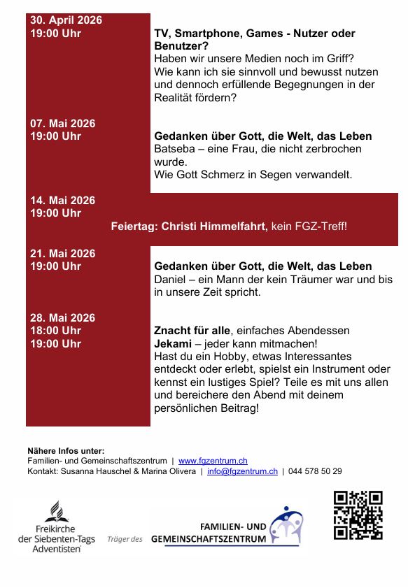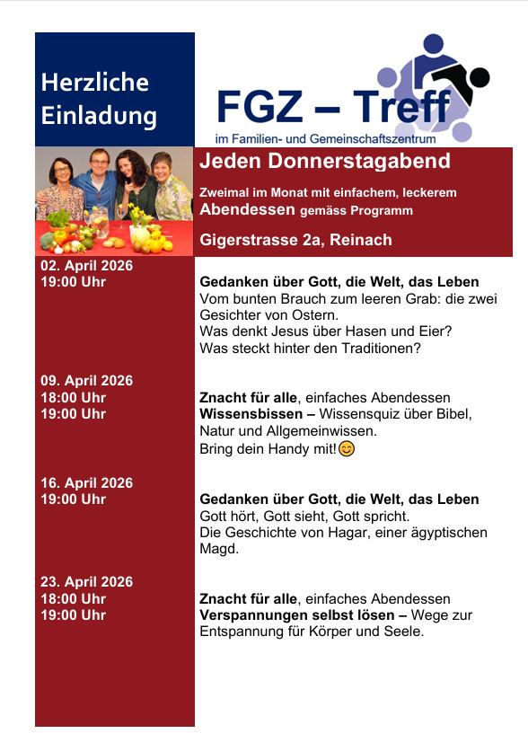 Jeden zweiten Dienstag (ungerade Kalenderwochen) lesen wir im FGZ gemeinsam von 15.15 bis 17.00 Uhr in der Bibel, tauschen unsere Gedanken aus und geniessen die Gemeinschaft miteinander. Es gibt ganz viel Platz für persönliche Gespräche und Fragen, und wir beten gemeinsam für unsere Anliegen.